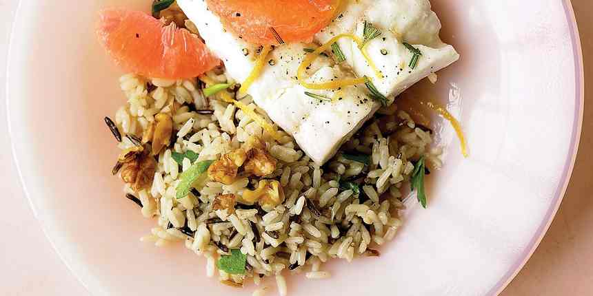 A marvelous, meaty option, halibut is more luxurious than inexpensive mild white fish fillets like tilapia, haddock, or catfish. Like most fish, halibut is loaded with omega-3 fatty acids (approximately 740mg in one five- to six-ounce serving!), plus magnesium and niacin. Like many types of seafood, halibut pairs especially well with citrus, such as our recipe for Halibut with Grapefruit and Rosemary, pictured here. The fish is broiled and served with a generous drizzle of an earthy grapefruit syrup.
